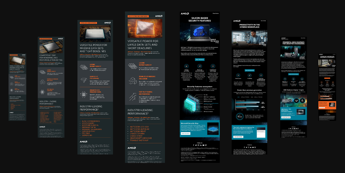 The Customer Experience (CX) team was deeply involved in campaign, web, and brand work for AMD. In the course of this engagement, we’ve become experts in their lineup of CPUs, GPUs, FPGAs, and Adaptive SoCs which, combined with deep software expertise, powers compute in countless cloud, edge, datacenter, and endpoint devices.